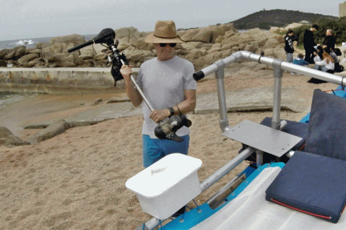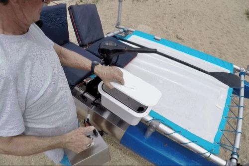 L'installation du moteur se fait dans un logement spécifique situé devant le pilote. Monter le moteur prends moins d'une minute. La batterie est connectée au moteur avec une prise de type " Anderson ". Elle se recharge à la maison en 6 heures. La mise à l'eau se fait grace à un chariot léger qui peut rouler sur le sable. Nous avons sélectionné deux ensembles de moteur et batterie, pour leur performance, fiabilité, silence, souplesse et facilité d'utilisation:
