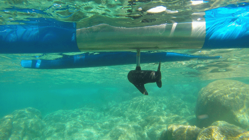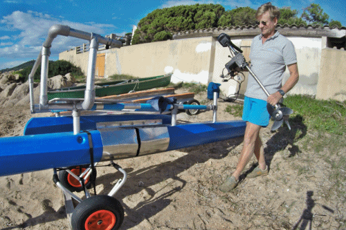 L'installation du moteur se fait dans un logement spécifique situé devant le pilote. Monter le moteur prends moins d'une minute. La batterie est connectée au moteur avec une prise de type " Anderson ". Elle se recharge à la maison en 6 heures. La mise à l'eau se fait grace à un chariot léger qui peut rouler sur le sable. Nous avons sélectionné deux ensembles de moteur et batterie, pour leur performance, fiabilité, silence, souplesse et facilité d'utilisation: